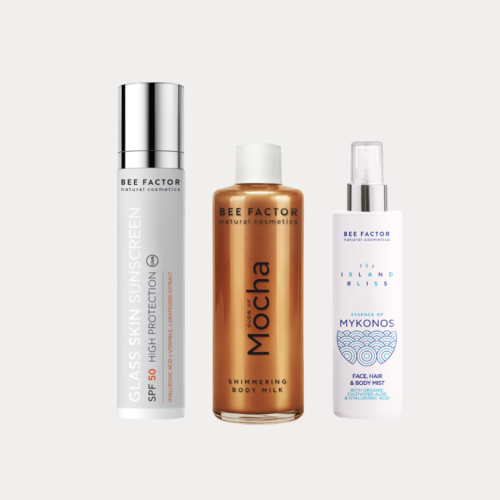 A glow essentials trio with sunscreen, body milk, and a refreshing face, hair & body mist.