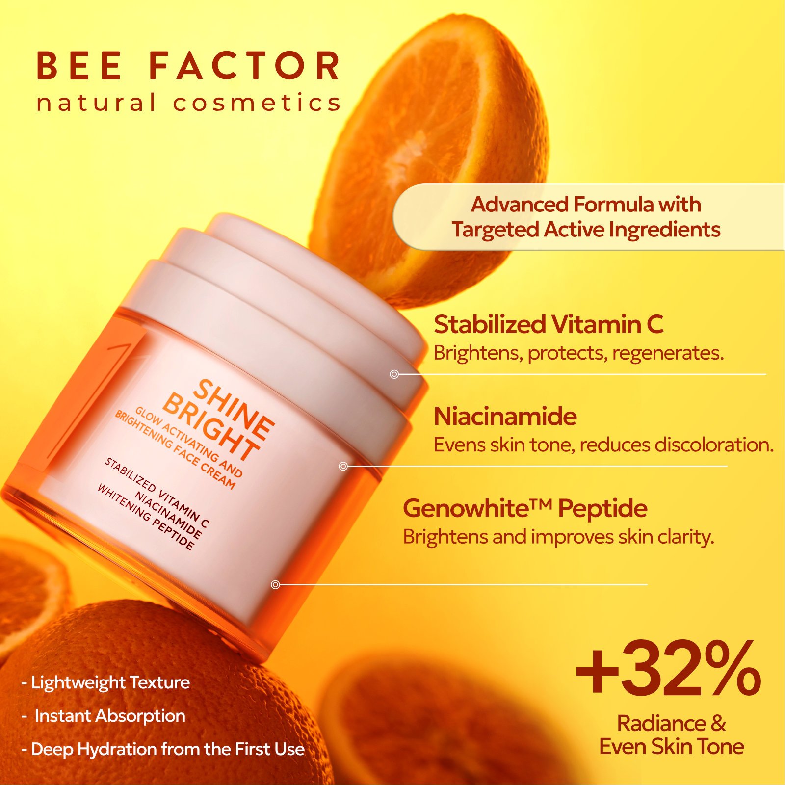- Clinically proven brightening peptide efficacy in 14 days*